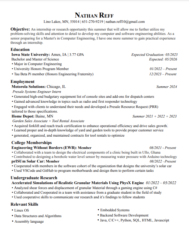 My name is Nathan Reff, and I am currently a Senior at Iowa State University pursuing a degree in computer engineering. I am also pursuing a minor in computer science, and plan to get my Masters and Bachelors in 5 years due to the 4 + 1 concurrent program that Iowa State Offers. I am a member in the Engineering Without Borders club.